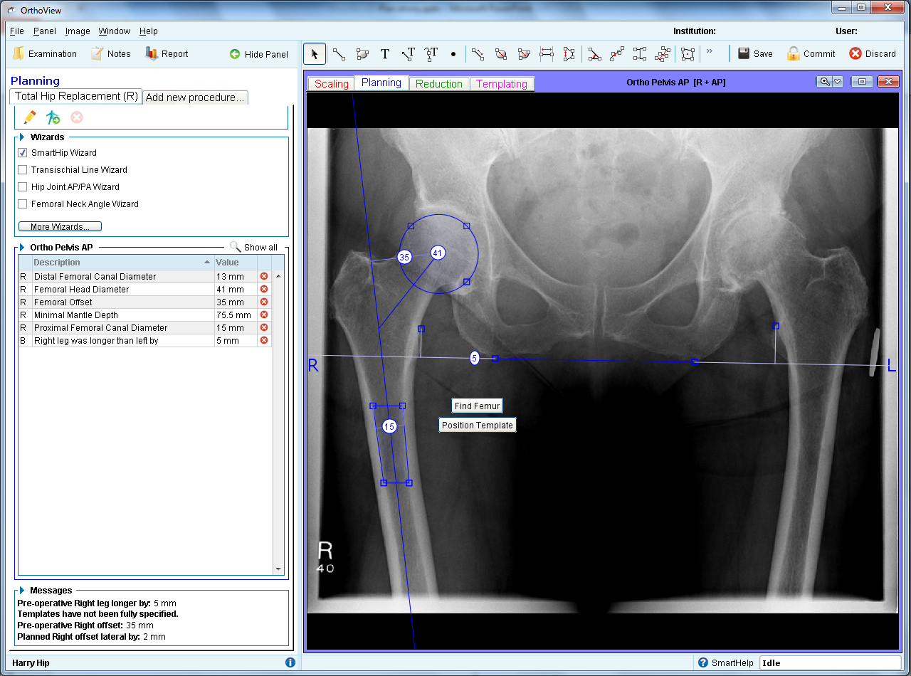 Oprogramowanie wykonuje pomiary ortopedyczne i traumatologiczne w oparciu o cyfrowe obrazy RTG wspomagające proces oceny sposobu dalszego postępowania w procedurach: