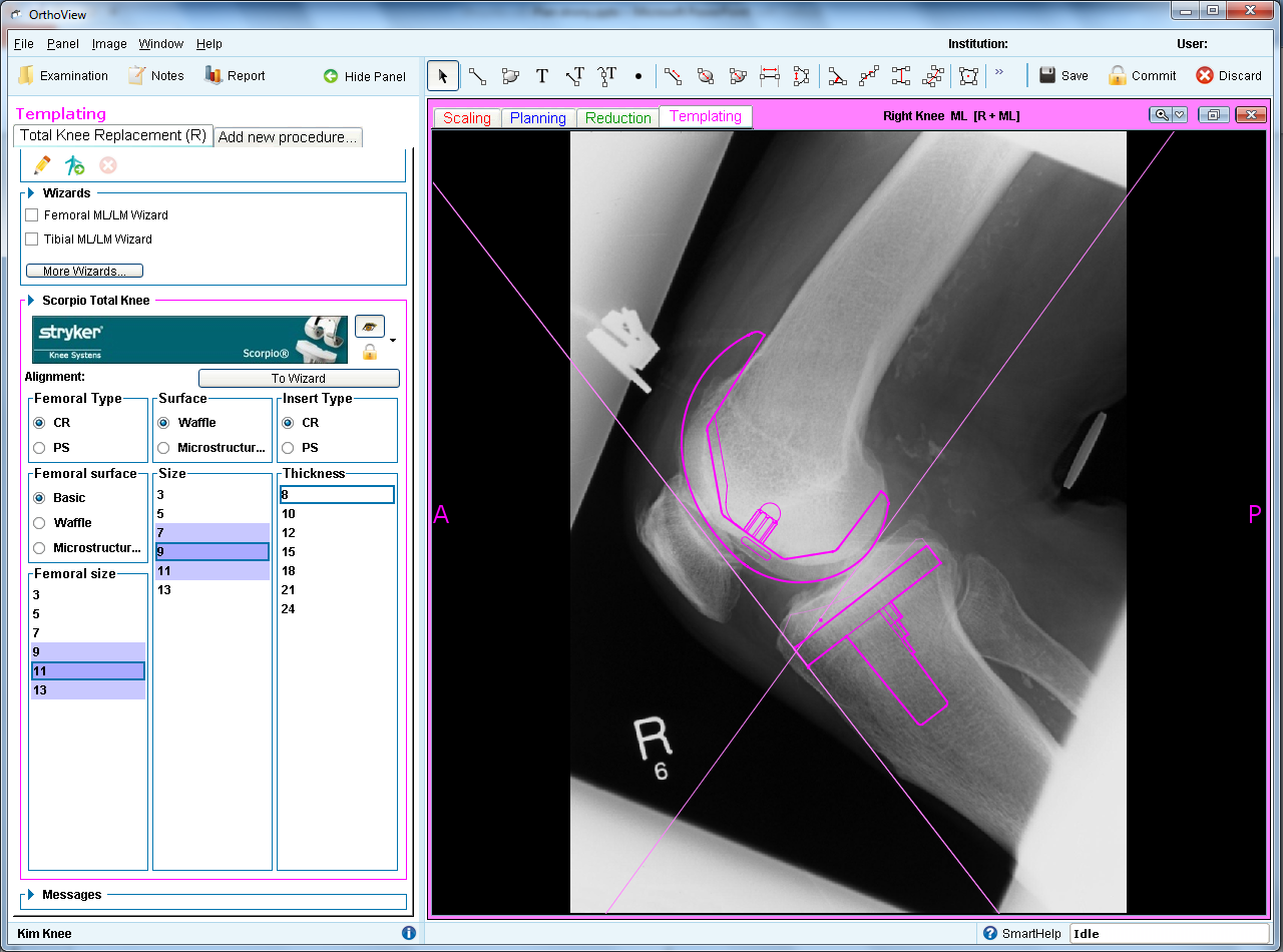Zestaw intuicyjnych w wykorzystaniu, gotowych schematów planowania (tzw. kreatorów) umożliwia użytkownikowi wykonanie planowania w szybki, łatwy i wyjątkowo dokładny sposób. Opierając się na ocenie wykonanej za pomocą tych kreatorów, OrthoView natychmiast podaje rekomendowane rozmiary i pozycję wybranych przez ortopedę protez. Zobacz, jak to wygląda na komputerze…