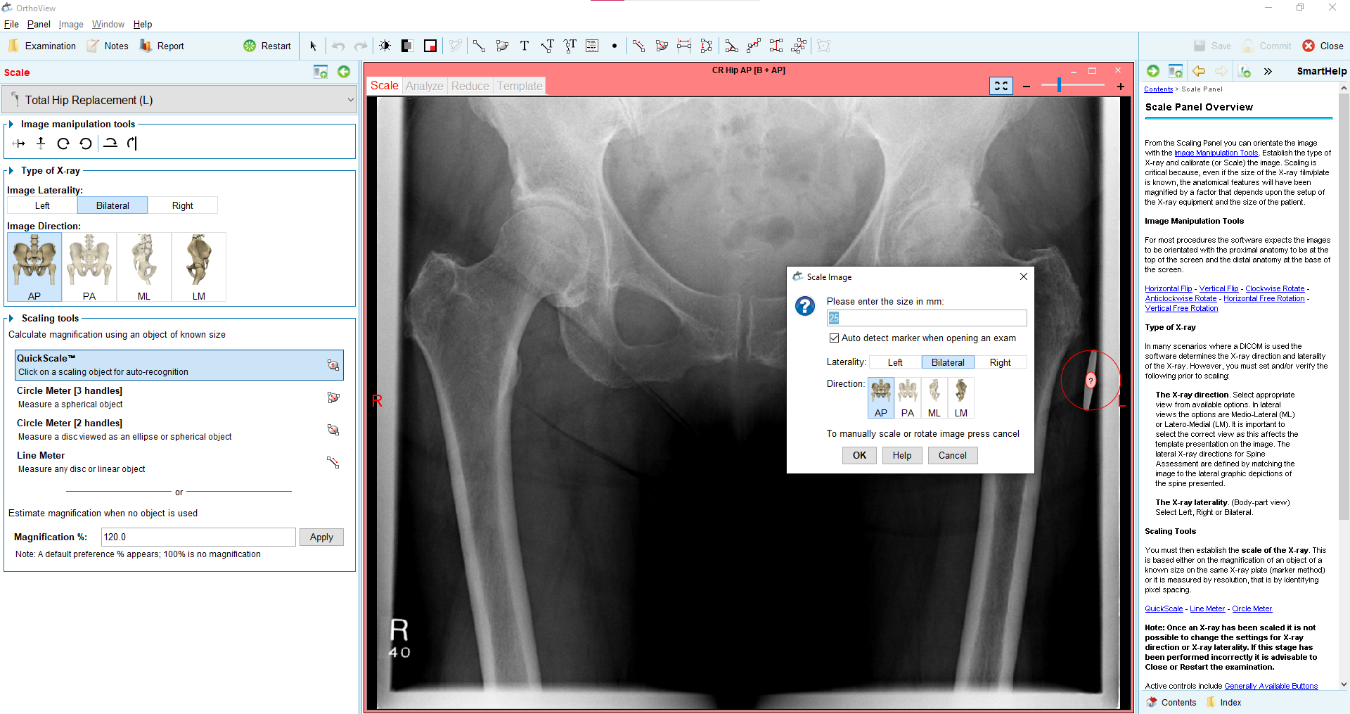 3. Automatycznie skalujemy zdjęcie z wykorzystaniem markera ortopedycznego. Dzięki temu w programie widzimy od teraz rzeczywiste pomiary anatomiczne pacjenta. Sprawdzamy także poprawność wyboru projekcji dla używanych obrazów radiologicznych