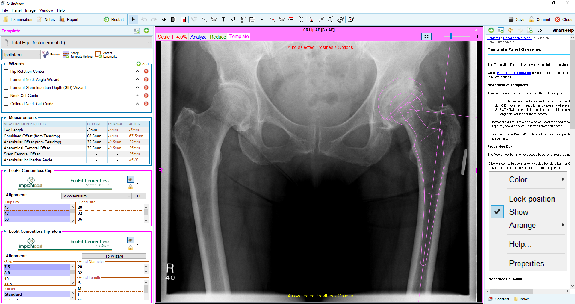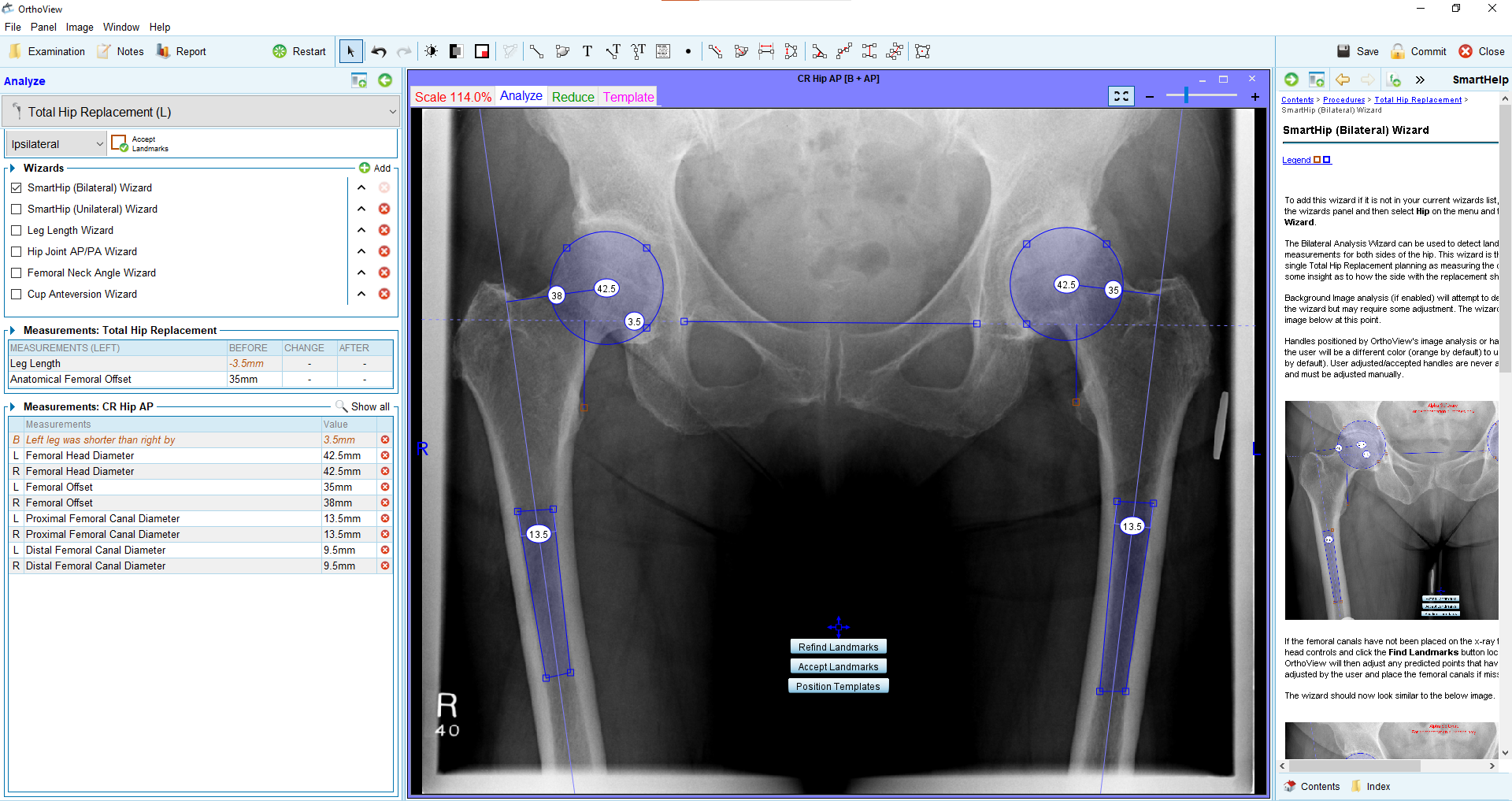 5. Wyznaczone automatycznie punkty anatomiczne możemy skorygować lub zaakceptować. Punkty anatomiczne wyznaczone automatycznie i oparte o nie pomiary zaznaczone są na pomarańczowo. Za pomocą przycisku „Position Template” możemy umieścić sugerowany rozmiar implantu na badaniu pacjenta.